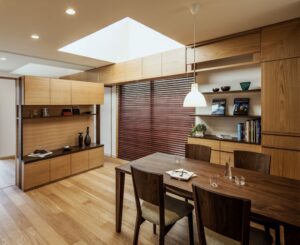 「自然素材を用いた気持ちよく楽しく暮らせる家」がコンセプト。廊下をつくらず、家の中にも窓を設けて、吹抜けを中心に1、2階にまたがるワンルームとなるように計画しました。風が通り抜け、お互いの気配も伝わります。このワンルームの中には、リビング、ダイニング、寝室はもちろん、回遊できるキッチンやパソコンデスクを組み込んだ壁いっぱいの本棚、吹抜けを見下ろすカウンターデスク、トップライトからの光があふれるロフトなどなど、普段の暮らしをさらにちょっと楽しくしてくれる場所がいくつもあります。使用する材料も、国産杉の柱・梁、無垢のフローリング、珪藻土の塗り壁等、お施主さんと一緒にこだわって選定しました。