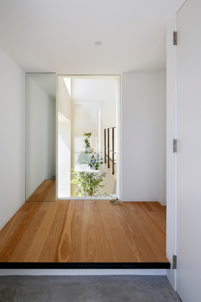 エントランスからヴォイドとそこに植えられた樹木(白文字)が正面に見えます。